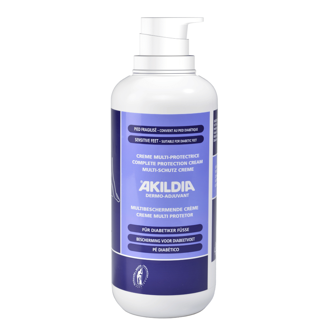 AKILDIA Multi-Protective Foot Cream: Provides comprehensive protection for fragile feet. Protects and regenerates the skin's moisture barrier. Combats discomfort caused by dryness. Provides deep and lasting hydration. Skin is silky and more supple. Gentle formula suitable for diabetic feet.