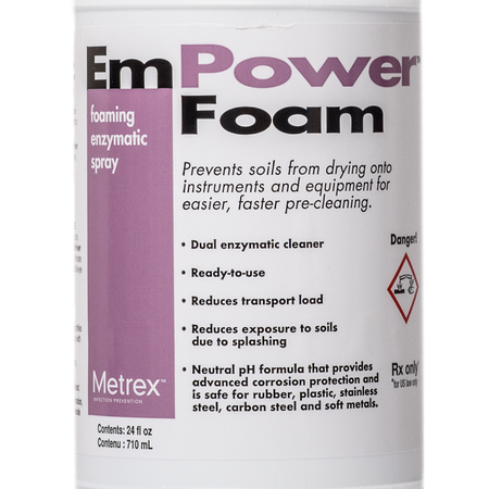 Foaming dual-enzymatic spray that starts the pre-cleaning process by breaking down blood, tissue, mucus and other protein-rich bodily fluids from instruments. The foaming spray delivery system is ideal for use in the operating room, sterile processing, and other departments where instrument cleaning is not immediately available.