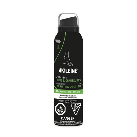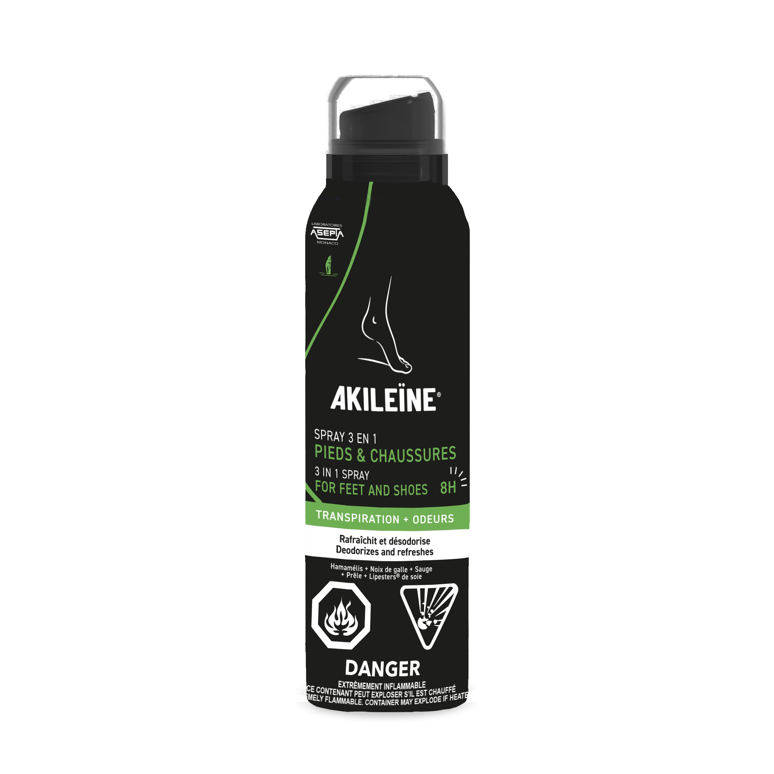 AKILEÏNE 3-in-1 Black Spray: Pleasantly refreshes and helps keep feet dry all day. Absorbs excess moisture. Deodorizes boots and shoes. Non-staining – Non-greasy.