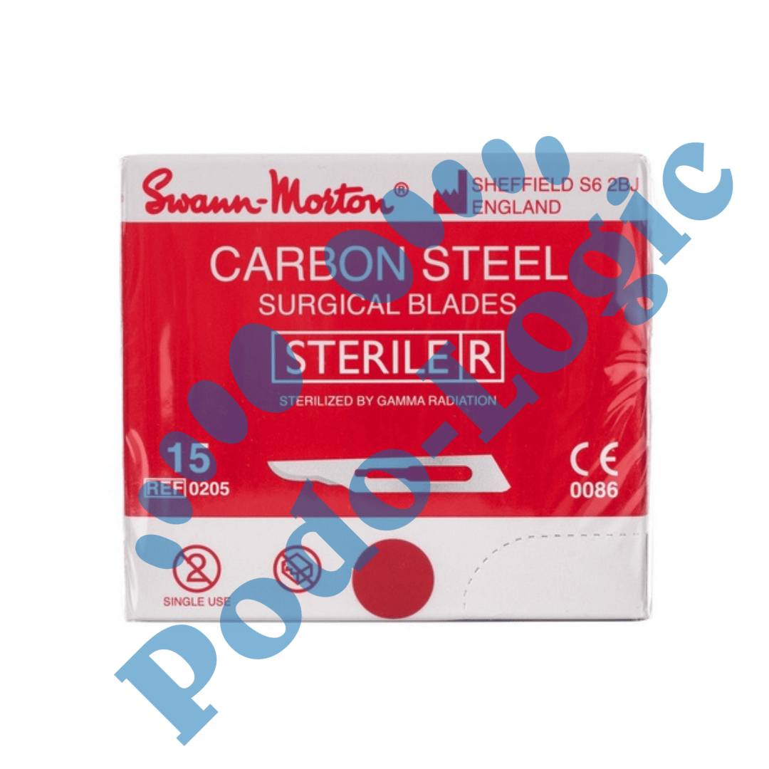 Box of 100 Swann-Morton brand disposable carbon sterile scalpel blades.