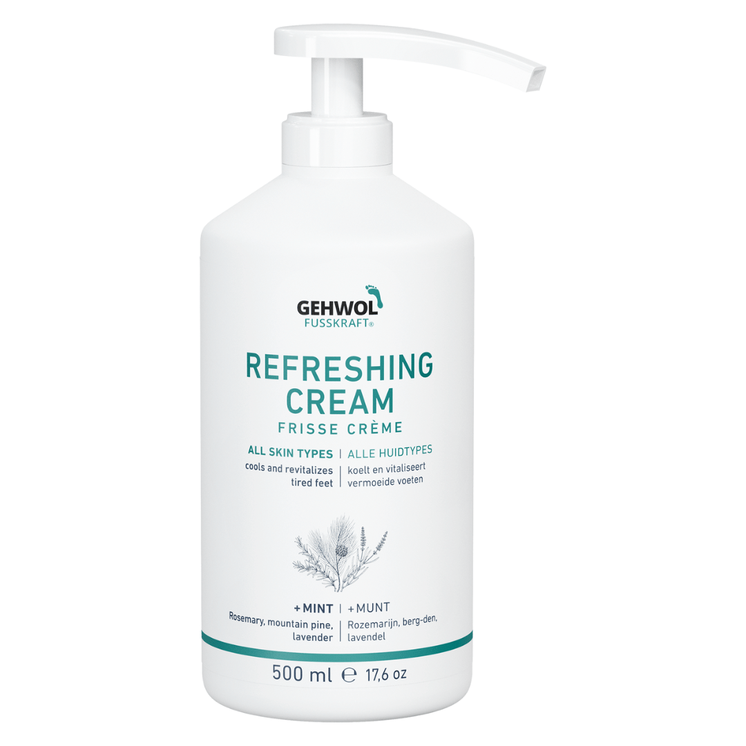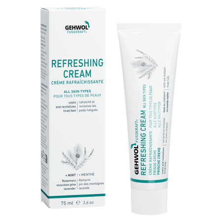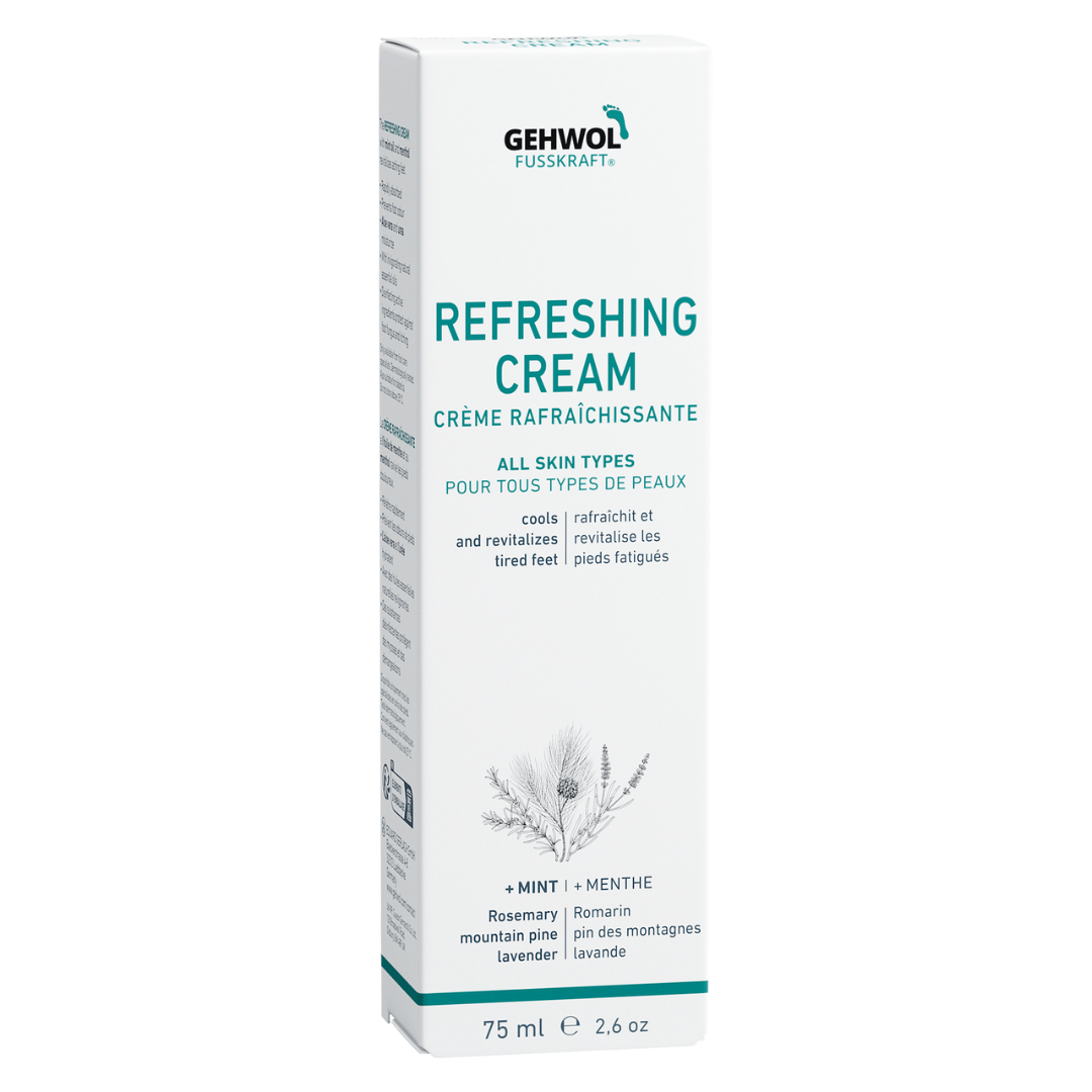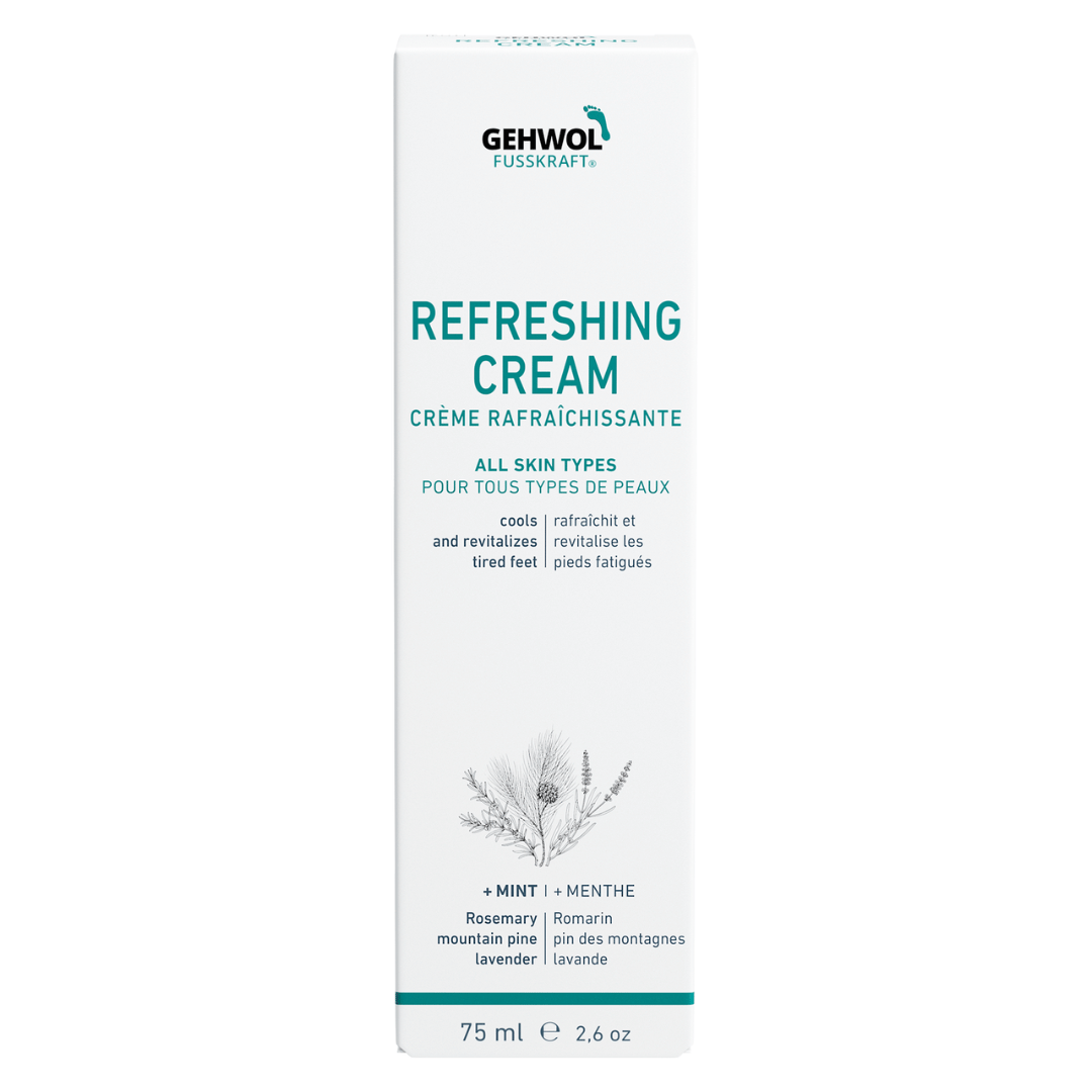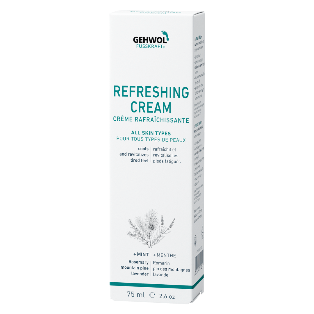 La Crème Rafraîchissante à l'huile de menthe et au menthol ravive les pieds douloureux.