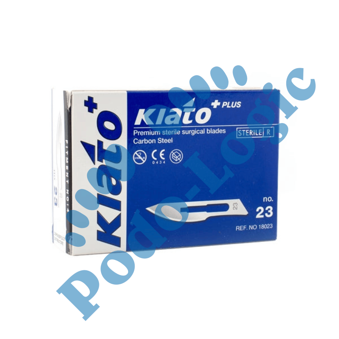Boîte de 100 lames de scalpel stériles Gamma en acier au carbone suisse, protégées par du papier VCI allemand et emballées individuellement dans un film plastique coloré facile à décoller.