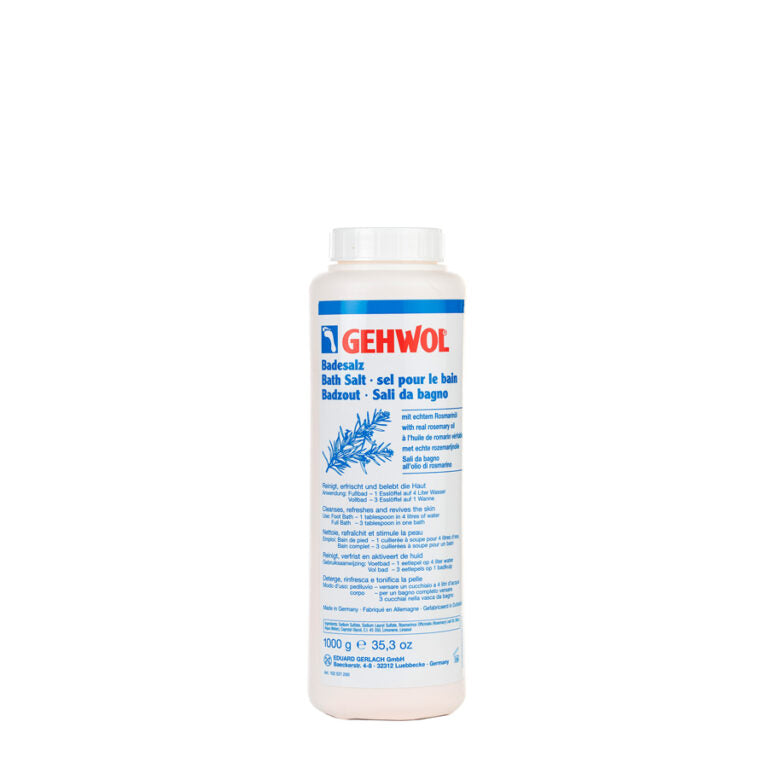 Un bain avec GEHWOL Sel pour le bain nettoie doucement et profondément, stimule la circulation sanguine de la peau, vivifie et fortifie. Les ingrédients calmants pénètrent profondément dans les pores, empêchent une transpiration excessive et désodorisent les pieds. Applicable pour bains de pieds ou bains complets. L’application régulière prévient les mycoses des pieds. Un fin parfum de romarin se dégage du bain, l’eau devient soyeuse. Un massage à l’aide d’une brosse renforce la sensation de bien-être.